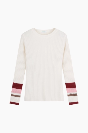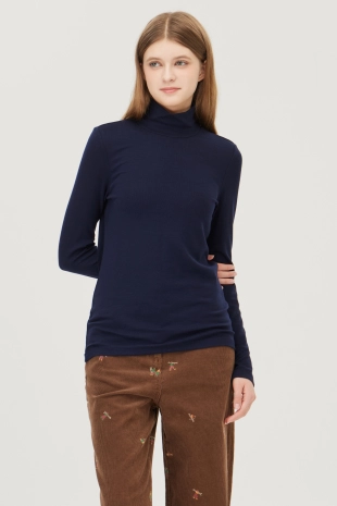 슬리브에 컬러 배색을 더해 유니크한 슬림 터틀넥 풀오버.
