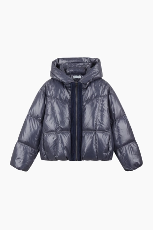 플라켓 부분에 컬러 니트 테이핑으로 포인트를 준 숏 다운.