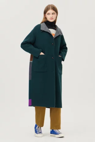 뒷면에 자카드 니트가 블록된 유니크한 디자인의 롱 코트.