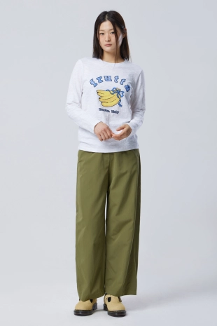 와이드한 프린팅으로 룩에 포인트를 더해줌.