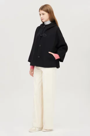 돌먼 슬리브와 루즈한 핏의 판초 스타일 후드 코트.