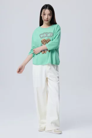 코알라 모티브의 자수와 테이핑 장식으로 포인트를 준 니트.