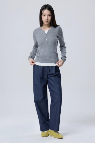 슬리브 끝단에 블록된 배색 컬러 디자인이 포인트인 니트.
