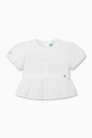 슬리브단과 밑단에 물결 라인 마감으로 발랄한 무드를 연출함.