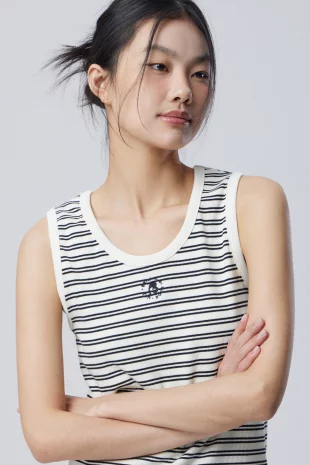 스트라이프 라인에 퍼피와 레터링 자수로 포인트를 준 니트 베스트.