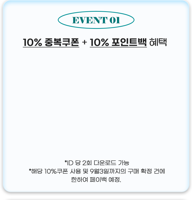 • 해당 10%쿠폰 사용 및 9월3일까지의 구매 확정 건에 한하여 페이백 예정