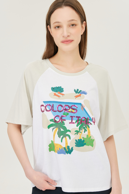 야자수 프린팅과 레터링 스팽글 장식으로 포인트를 준 티셔츠.