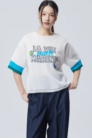 센터에 감각적인 그래픽으로 포인트를 준 캐주얼한 티셔츠.