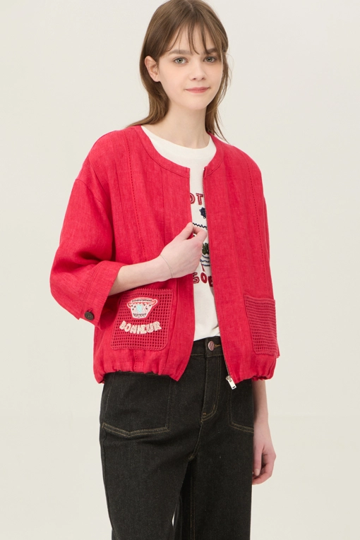 메쉬 포켓에 배색 자수 디자인으로 포인트를 준 집업 점퍼.