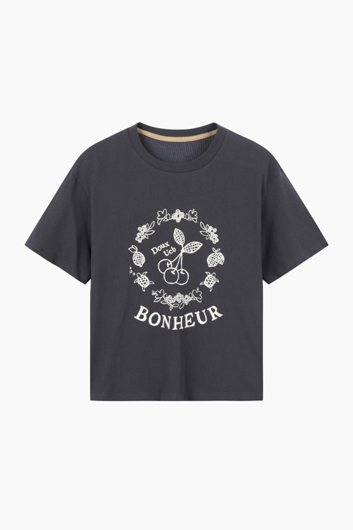 체리 배색 프린팅으로 캐주얼한 무드의 반팔 티셔츠.