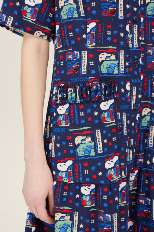유니크한 올오버 패턴으로 포인트를 준 A라인 롱 원피스.