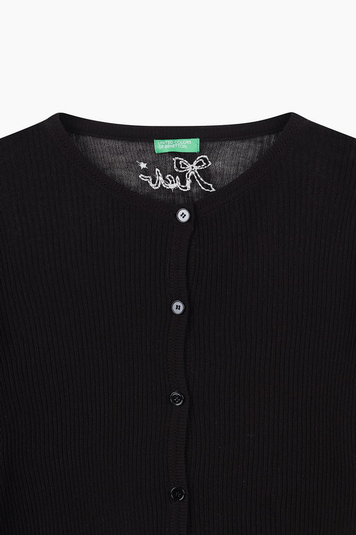 뒷 넥라인에 리본 자수로 페미닌한 무드를 연출하는 가디건.