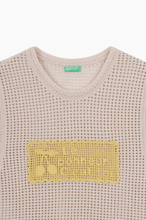 배색 자수 패치가 돋보이는 메쉬 짜임의 니트 베스트.