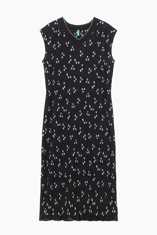 스트라이프 스모킹 디자인과 배색 컬러 패턴이 매력적인 슬리브리스 원피스.
