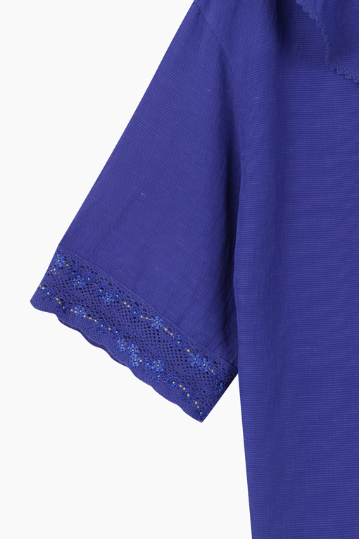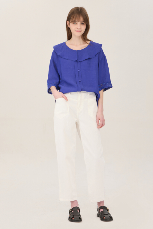 슬리브단 크로셰 플라워 배색 자수로 포인트를 준 블라우스.