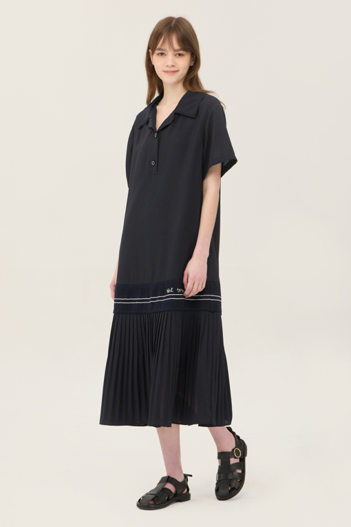 밑단 메쉬 라인과 배색 자수로 포인트를 준 플리츠 원피스.