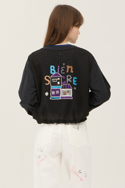 등판 메쉬 소재에 하우스 배색 그래픽 자수로 포인트를 준 점퍼.
