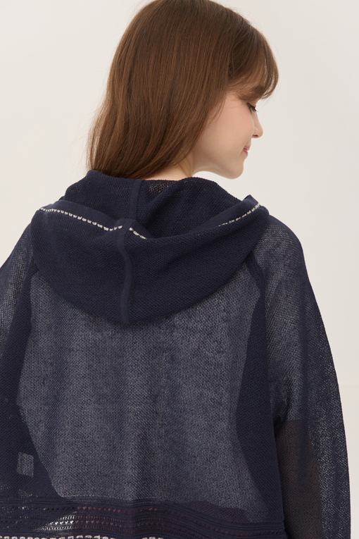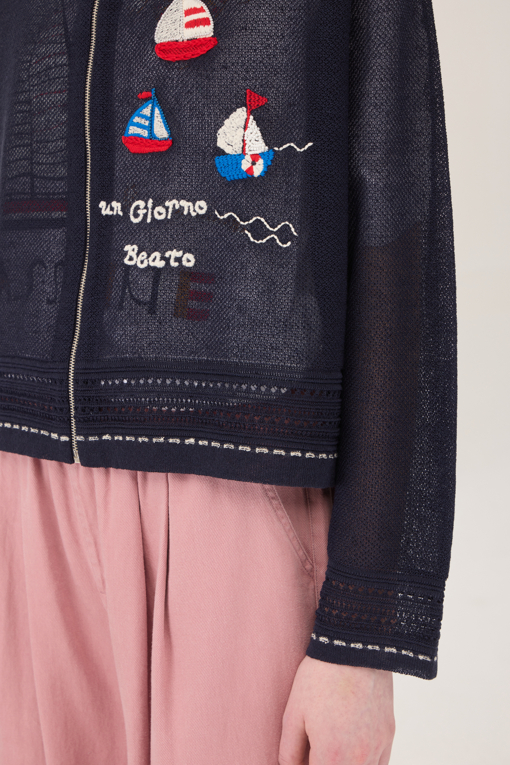 돛단배 모티브의 배색 자수로 포인트를 준 니트 가디건.