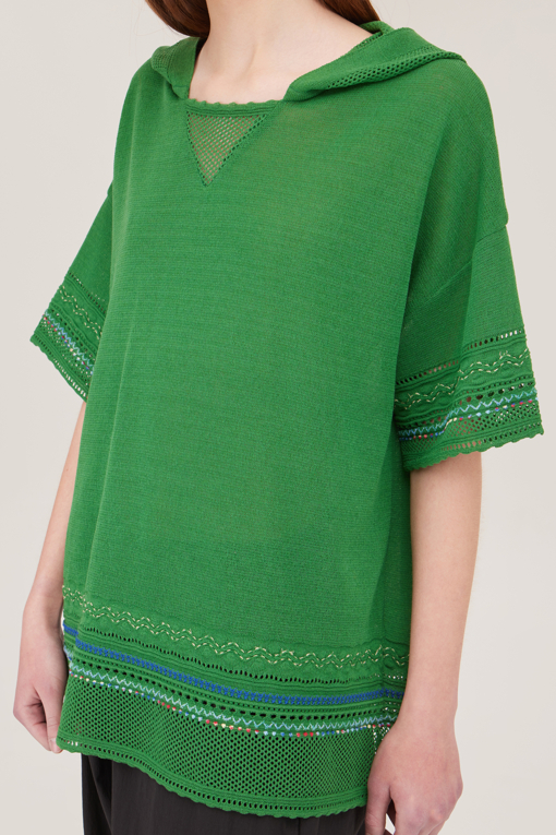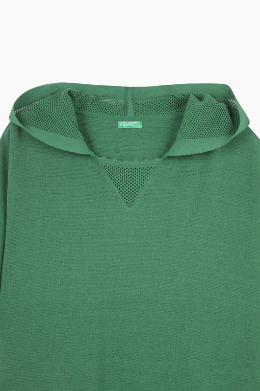 부분 블록 메쉬 소재와 배색 자수 라인이 돋보이는 후드 니트.