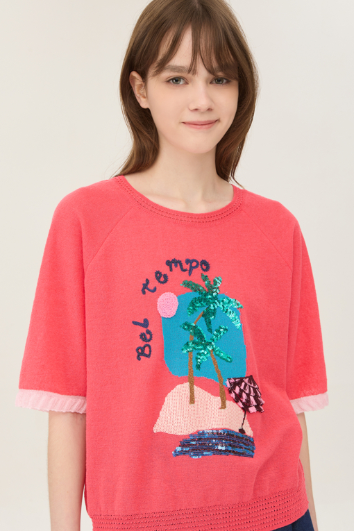 썸머 그래픽의 야자수 스팽글 디자인이 돋보이는 반팔 니트.
