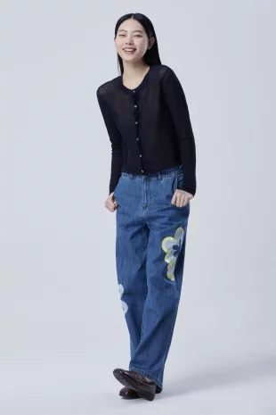 밑단에 배색 자수로 경쾌한 무드를 연출하는 니트 가디건.