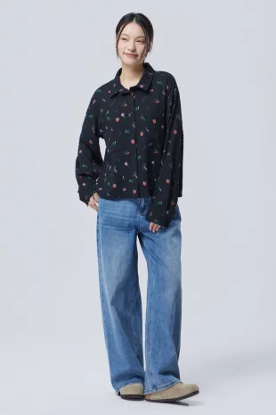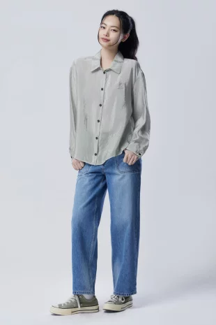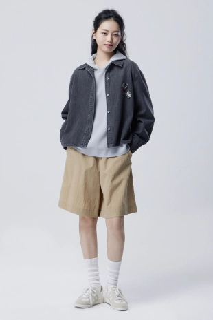 셔츠형 풀 버튼 여밈으로 깔끔한 아웃핏을 연출함.