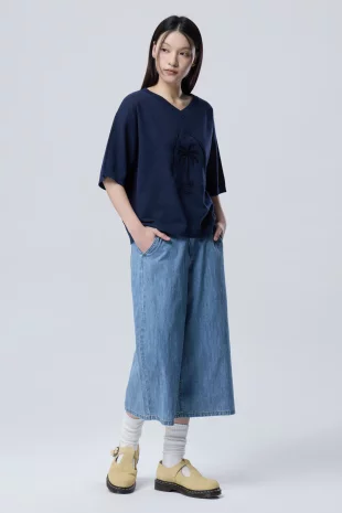 다양한 룩에 매치하기 용이한 베이직한 디자인의 크롭 팬츠.