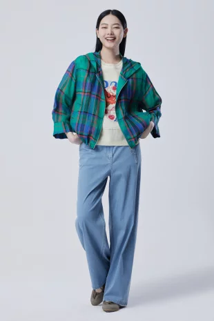 배색 자수와 체커보드 패턴으로 포인트를 준 후드 집업 가디건.