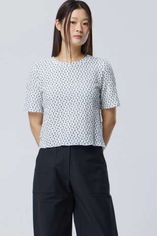 센터에 배색 프린팅을 더해 포인트를 준 캐주얼 반팔 티셔츠.