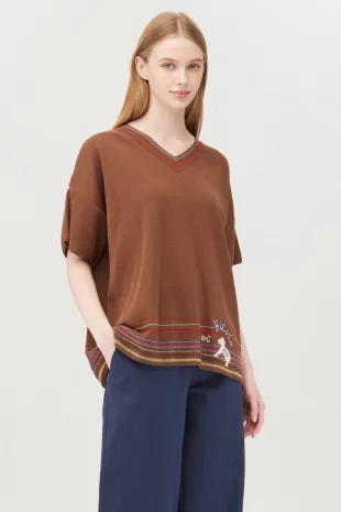 배색 니트 짜임의 브이넥 라인으로 포인트를 준 티셔츠.