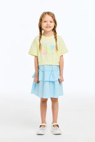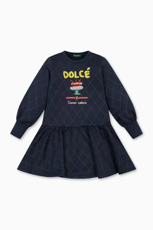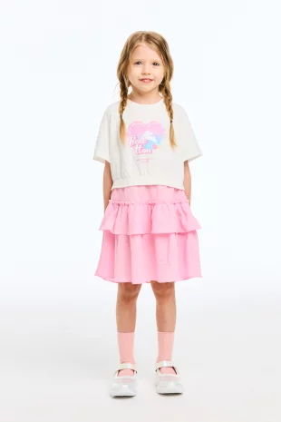맨투맨 티셔츠와 샤 스커트를 레이어드한 디자인의 원피스.