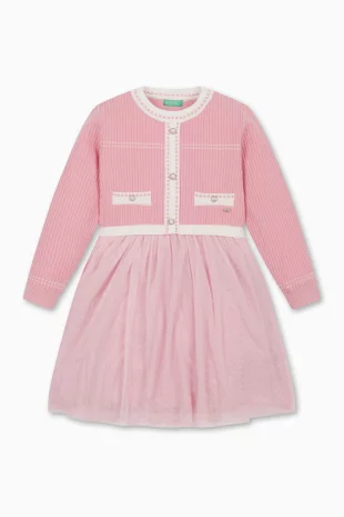 풍성한 플리츠 스커트와 밑단 러플로 러블리함을 강조함.