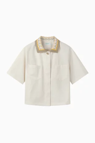 배색 플라워 패턴으로 페미닌한 무드를 연출하는 블라우스.