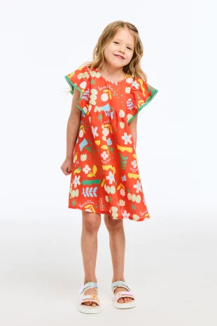 시즌 무드가 느껴지는 컬러감 있는 프룻 패턴이 매력적인 원피스.